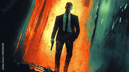 © Slamet, Obraz premium Agent walking through fire-damaged building, intense background, action thriller poster