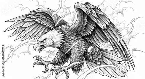 © Amalia, Obraz premium Aggressive Bald Eagle Diving Grayscale Tattoo Vector