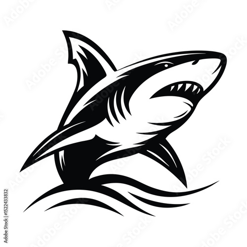 © Shipon, Obraz premium Aggressive Black and White Shark with Open Mouth Silhouette, Isolated On White