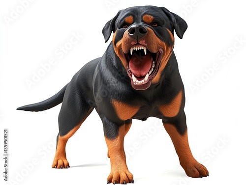 Obraz premium Aggressive Rottweiler, teeth bared, snarling intensely, against a stark white...