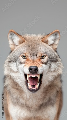 Fototapeta premium Aggressive Wolf with Fangs Wild Animal Portrait Gray Background