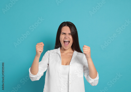 Fototapeta premium Aggressive young woman shouting on turquoise background