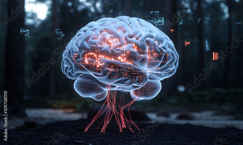 Fototapeta premium AGI Brain embedded in a forest with glowing elements