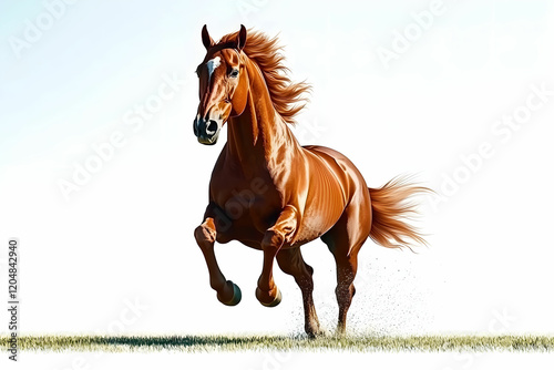 © Arthur Constantine, Obraz premium Agile Chestnut Horse Galloping in Open Field Under Clear Sky