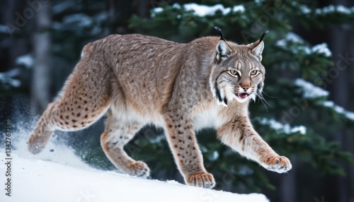 Fototapeta premium Agile lynx pouncing through a snowy wilderness