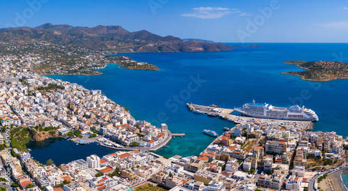 Naklejka premium Agios Nikolaos, a picturesque coastal town with colorful buildings around...