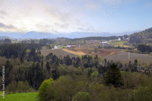 © liramaigums, Obraz premium Agricultural area Bratsberg in the spring, Norway