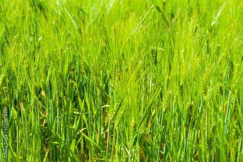 © Ilmar, Obraz premium Agricultural background from fresh green ears of cereals. Green ears of young rye.