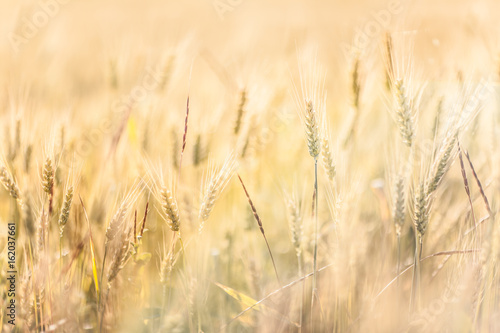 Fototapeta premium Agricultural Background with Ripe golden rays of the low sun backlight. Rural scene with limited depth of field.