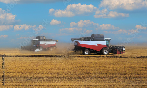 Fototapeta premium Agricultural combines harvesting wheat