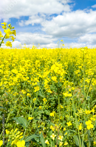 © Payllik, Obraz premium Agricultural crop rapeseed. Yellow fields and seedlings