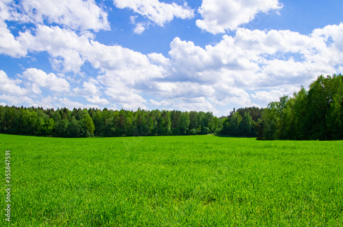 Obraz premium Agricultural field landscape of green grass in summer with blue sky