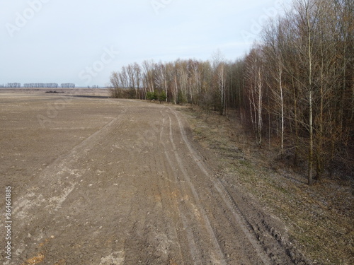 © Oleksii, Naklejka premium Agricultural field near the forest, aerial view. Landscape.