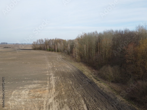 Fototapeta premium Agricultural field near the forest, aerial view. Landscape.