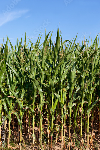 © rsooll, Fototapeta premium agricultural field where green corn grows, closeup