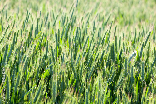 © rsooll, Obraz premium agricultural field where green wheat grows