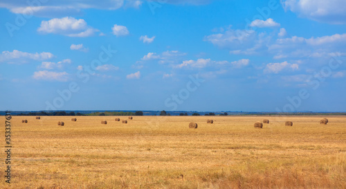 © Leilani, Obraz premium agricultural field with hay bales in the summer