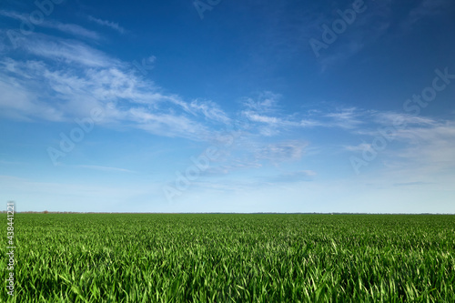 © soleg, Obraz premium agricultural field with young sprouts and a blue sky with clouds - a beautiful spring landscape