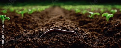 Fototapeta premium Agricultural growth showing benefits of healthy soil concept. A worm thriving in rich soil amongst young green plants.