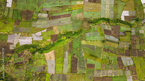 © Alex Traveler, Obraz premium Agricultural land with sown green fields in countryside. Kayu Aro, Indonesia.