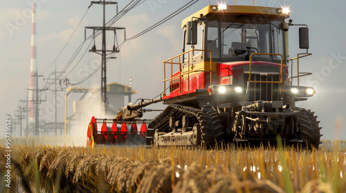 Fototapeta premium Agricultural machinery working in a vast rice field, harvesting crops with...