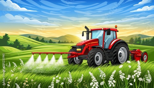 © Ilja, Fototapeta premium Agricultural tractor in sunset field infographic banner design for food production industry