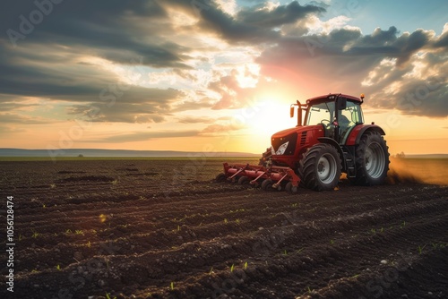 © Festive Hub, Fototapeta premium Agricultural Tractor Working in Field Under Dramatic Sky