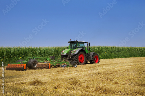 © pavlobaliukh, Fototapeta premium agricultural tractor working in the field after harvesting wheat next to a cornfield