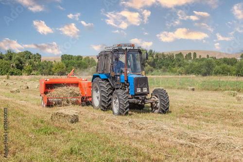 © kvdkz, Naklejka premium Agricultural work. Hay harvesting. Tractor collects straw into bales