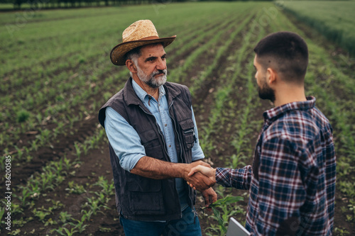 © cherryandbees, Fototapeta premium agricultural workers handshake on corn field