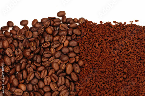 © Studiomiracle, Naklejka premium agriculture, arabic, aroma, aromatic, backdrop, background, bean, beverage, black, brazil, breakfast, brown, cafe, caffeine, cappuccino, close, close-up, closeup, coffee bean, coffee cup, coffee powde