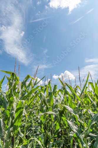 © Djordje, Obraz premium agriculture corn plants seedlings with blue sky and clouds. agricultural background.