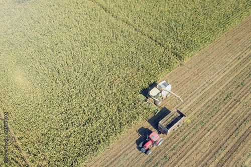 © allexxandarx, Obraz premium Agriculture cutting silage and filling trailer in field Aerial View
