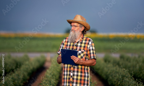 © bobex73, Obraz premium Agriculture. Farmer checking plants in the field and making a notes. Agricultural concept