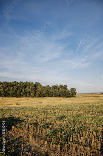© Лилия Люцко, Fototapeta premium Agriculture. Field after harvest with rolls of hay. Landscape with agricultural land, straw and meadow near the forest. Cereals harvesting yellow wheat