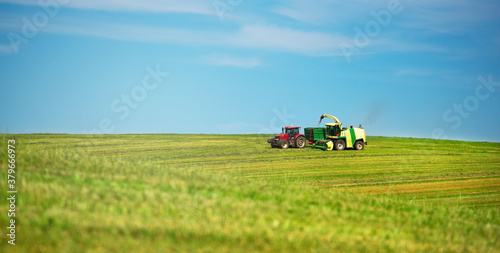 © Simona, Obraz premium Agriculture. Mowing meadows. Technology. Farmer mowing his field on the tractor.