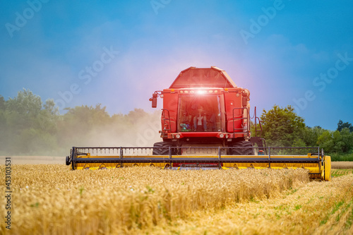 © Vadim, Fototapeta premium Agriculture process in wheat field during the sunny day with blue sky. Heavy technics. Rural landscape. Harvest time