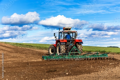 © martinfredy, Fototapeta premium Agriculture red tractor cultivating field over blue sky. Old red tractor in the agricultural field; mechanism. Tractor plowing land. Harvester sowing wheat.