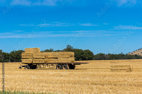 Fototapeta premium Agriculture scene. Farmers trailer loaded with hay bales on a fi