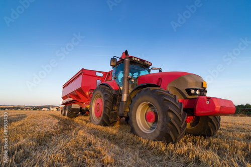 © hopsalka, Fototapeta premium Agriculture tractor and trailer on a stubble field, copy space for text