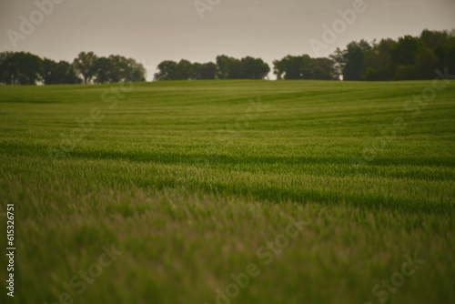 © AlexGo, Obraz premium Agriculture young wheat field. wheat field at dawn. Scenic image of agrarian land in springtime. Discover the beauty of the earth.