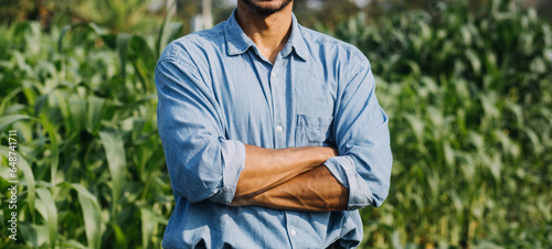 Fototapeta premium Agriculturist utilize the core data network in the Internet from the mobile to validate, test, and select the new crop method. Young farmers and tobacco farming