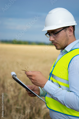 Fototapeta premium Agro engineer at the field inspection, the farmer stands in a wheat field with a folder in his hands and checks the harvest, the engineer stands in a field with wheat