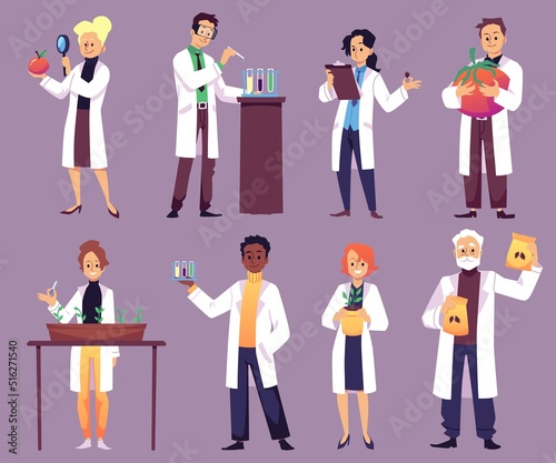 Obraz premium Agronomy scientists with vegetables, test tubes, seeds in their hands isolated