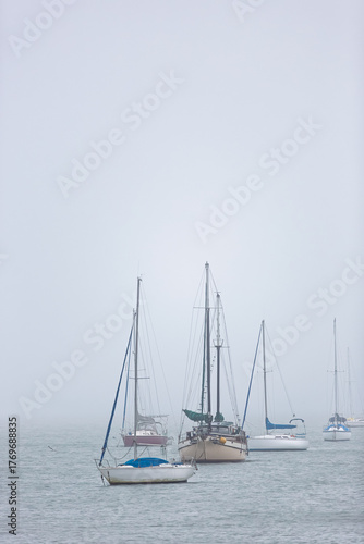 © Mario, Fototapeta premium Agrupamento de veleiros com mastros altos ancorados na névoa da baía