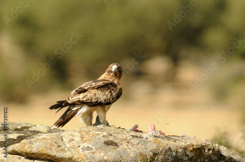 Obraz premium aguila calzada con presa en primavera en el bosque
