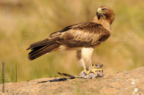 Fototapeta premium Aguila calzada con una presa sobre la roca