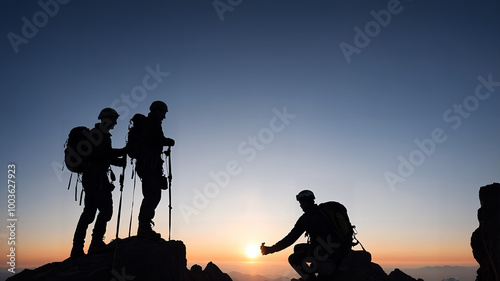 Obraz premium 相互援助によって山頂にたどり着いた登山者たちのシルエットが描くチームワーク。生成AI