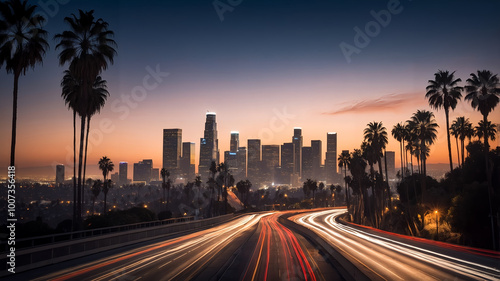 © Ascending Dragon, Fototapeta premium ヤシの木が前景に映えるロサンゼルスのスカイラインが描く、都会の美しさ。生成AI