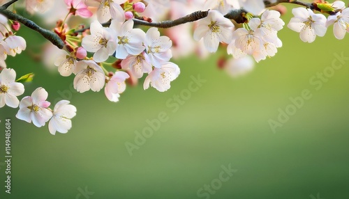 © AI_ALICE, Obraz premium 春の緑色の背景にピンク色の桜の木と花びらのフレーム素材のイラスト。AIで生成